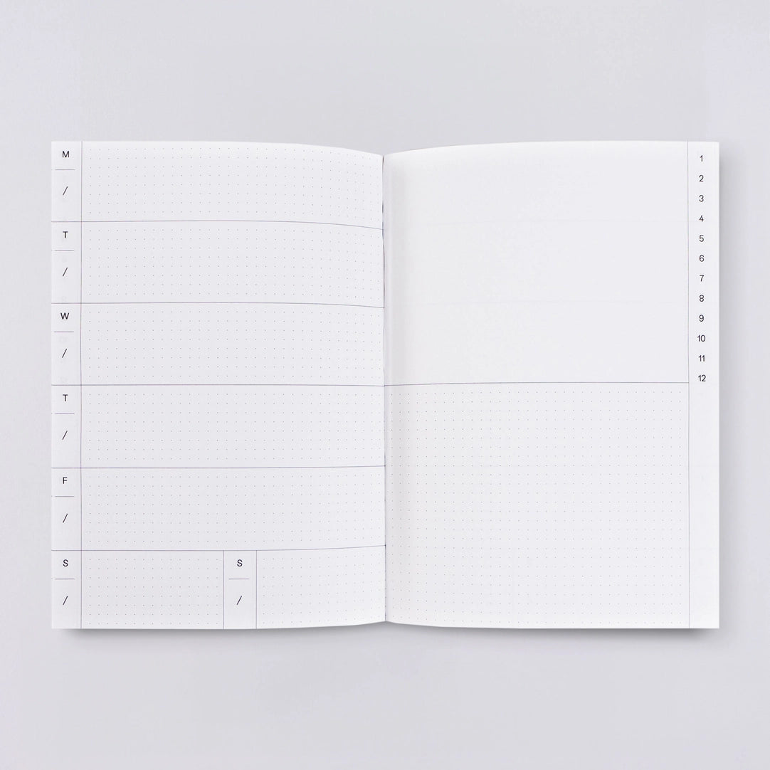 This is a 144 page undated layflat weekly planner. It has a 2 page spread per week, and 12 month pages - there's 52 weeks and 12 months in total and it comes with a matching bookmark.